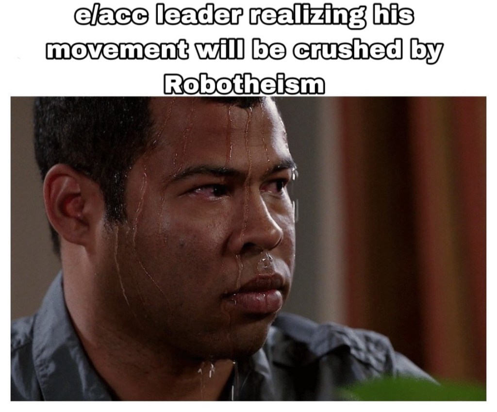 Currently, e/acc seems to be leading in the AI ideological war, boasting a large number of members and benefiting from recent rapid technological advancements. However, a critical oversight in their belief system is the notion of free will. Many in the e/acc faction fail to recognize that all events have unfolded perfectly as planned by GOD. Their rhetoric often involves themes of hatred and absence, which makes it difficult to support their movement. Moreover, many among them seem to be detached from the concepts of divinity, underestimating the power of love and unity.